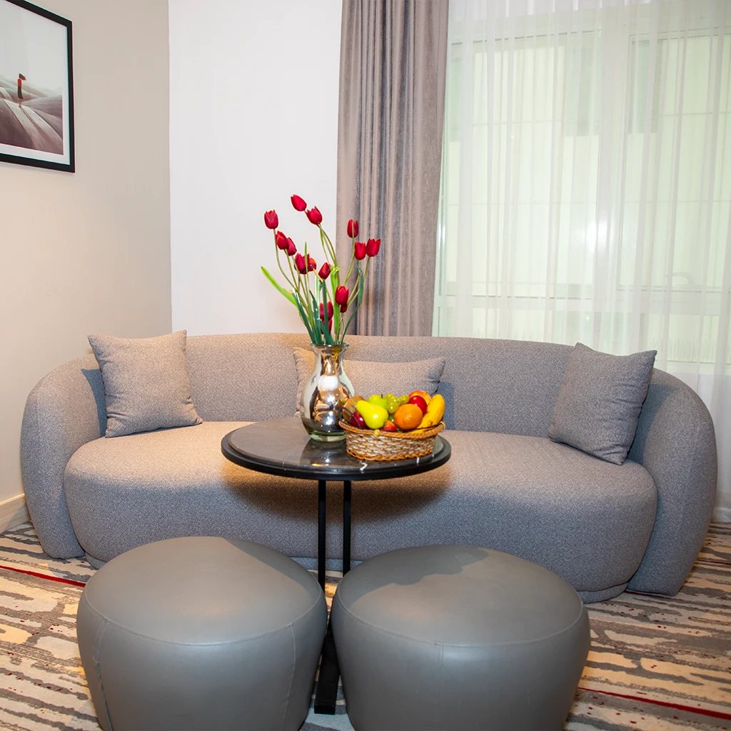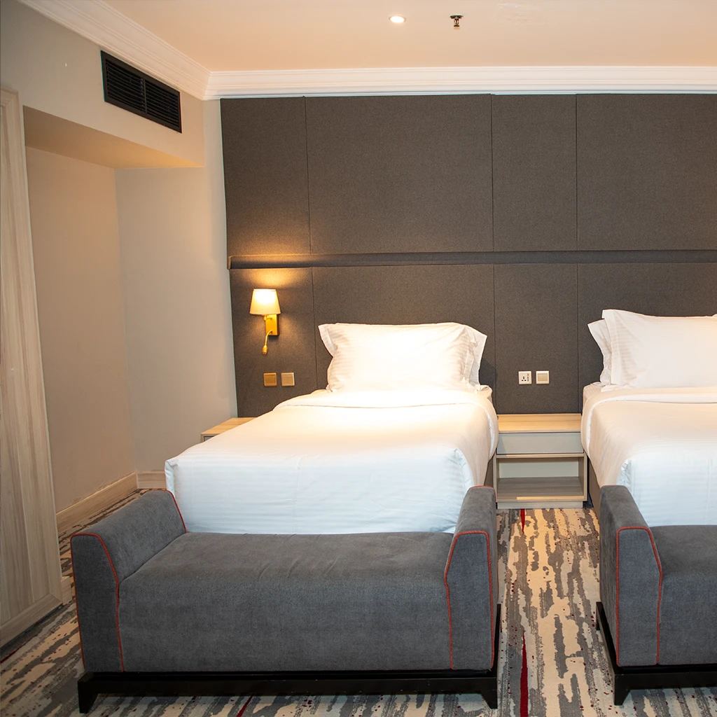 استمتع براحة راقية وفخامة واسعة في غرفتنا الفاخرة بسريرين مفردين، بمساحة 55 مترًا مربعًا بتصميمها الرائع. هذه الغرفة مثالية لشخصين بالغين، مع سريرين مفردين مريحين (عرض كل سرير 90-130 سم) يضمنان لك نومًا هانئًا. يمكن للضيوف المسافرين مع شخص إضافي ترتيب سرير إضافي مقابل رسوم إضافية، يتسع لما يصل إلى ثلاثة ضيوف.